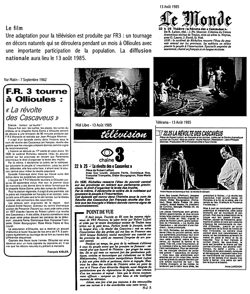 Le 13 août 1985 (il y a 40 ans), la chaîne de télévision FR3 diffusait sur les antennes nationales un film tourné à Ollioules à partir de la pièce de théâtre « La révolte des Cascavèus » écrite en 1977 par Robèrt Lafont et mise en scène la même année par le Centre dramatique occitan de Provence (compagnie théâtrale implanté à Toulon depuis 1971 pour rompre notamment avec la représentation complaisante de la culture provençale folklorisante). Présentation du texte écrit en 1977 par Robèrt Lafont : « En 1630, un édit de Richelieu dépossède la noblesse d’une partie de ses prérogatives. Celle-ci pousse la population aixoise à la révolte. Mais devant le risque d’être débordée, elle fait volte-face et se rallie au pouvoir royal. Ignorée des livres de l’histoire officielle, cette révolte est peu connue. Elle témoigne d’une lutte permanente du peuple d’Oc pour son identité, pour la défense de sa culture, de ses libertés. Révolte réussie, révolution manquée, celle des Cascavèus (du nom du grelot servant de signe de ralliement) méritait d’être connue. Robèrt Lafont s’y est employé : il en résulte un texte plein de vie, d’une intensité dramatique et humaine touchante et souvent teinté d’un humour acre ou féroce ».