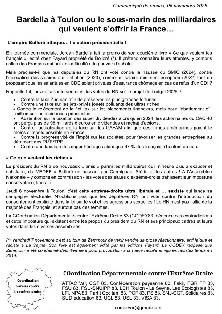 Ci-dessous le communiqué publié par la COordination Départementale contre l’EXtrême droite (CODEX 83) à l’occasion de la venue de Jordan Bardella le 6 novembre 2025 à Toulon pour la signature de son nouveau livre.