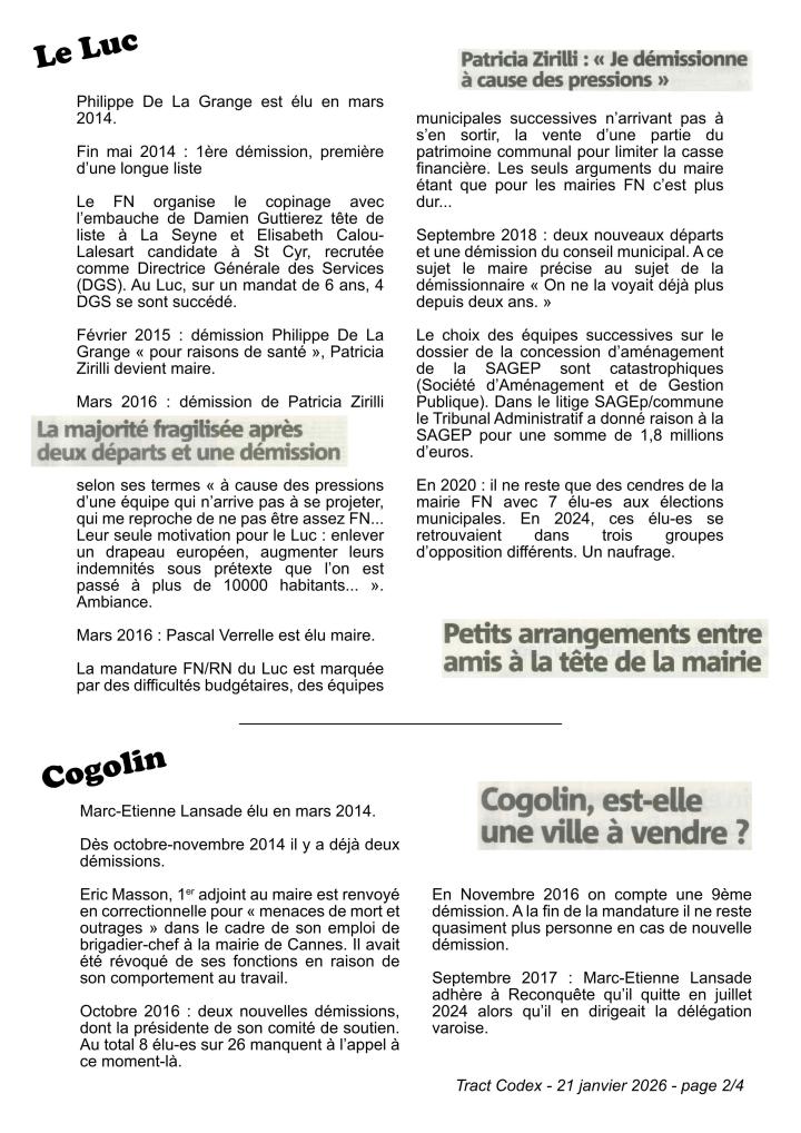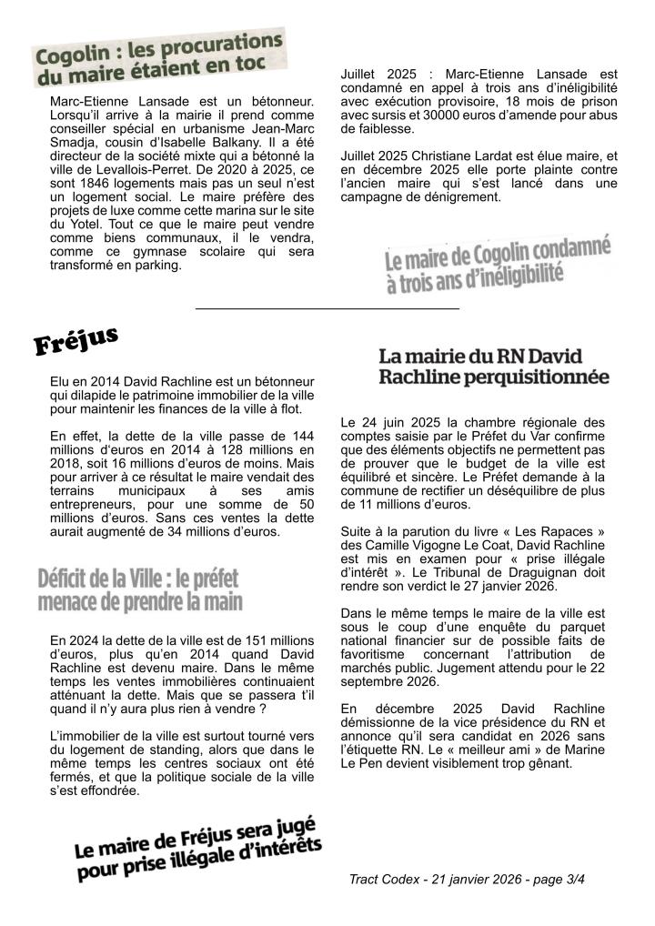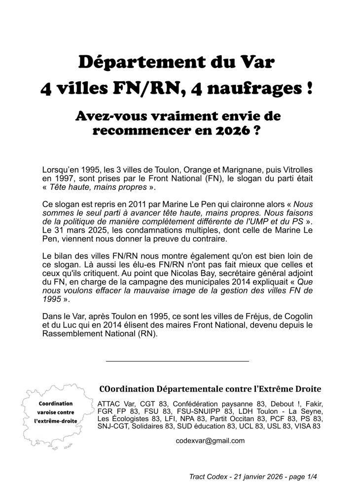 Ci-dessous un tract de 4 pages publié le 21 janvier 2026 par la CODEX 83 (COordination Départementale contre l’Extrême Droite) dans la perspective des élections municipales qui auront lieu le 15 mars prochain.