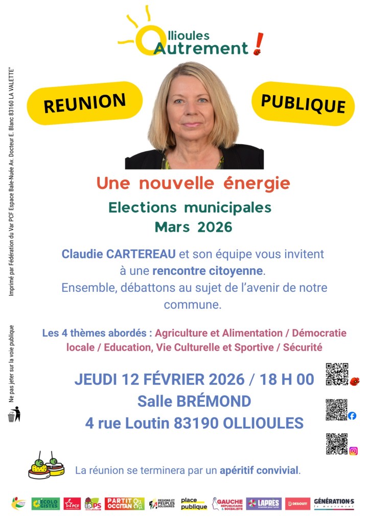 Jeudi 12 février à 18 h (Espace Brémond, 4 rue Loutin), Claudie Cartereau et toute l’équipe de la liste Ollioules Autrement vous invitent à une rencontre citoyenne. Ensemble, discutons de l’avenir de notre commune ! Les thèmes abordés seront le suivants : Agriculture et alimentation / Démocratie locale / Éducation, vie culturelle et sportive / Sécurité. La réunion se terminera par un apéritif convivial.