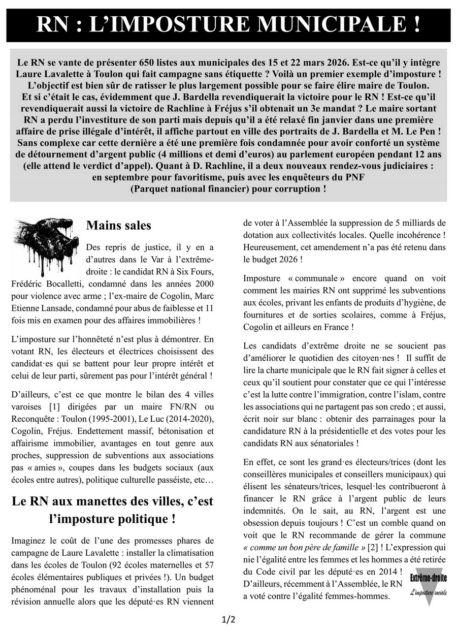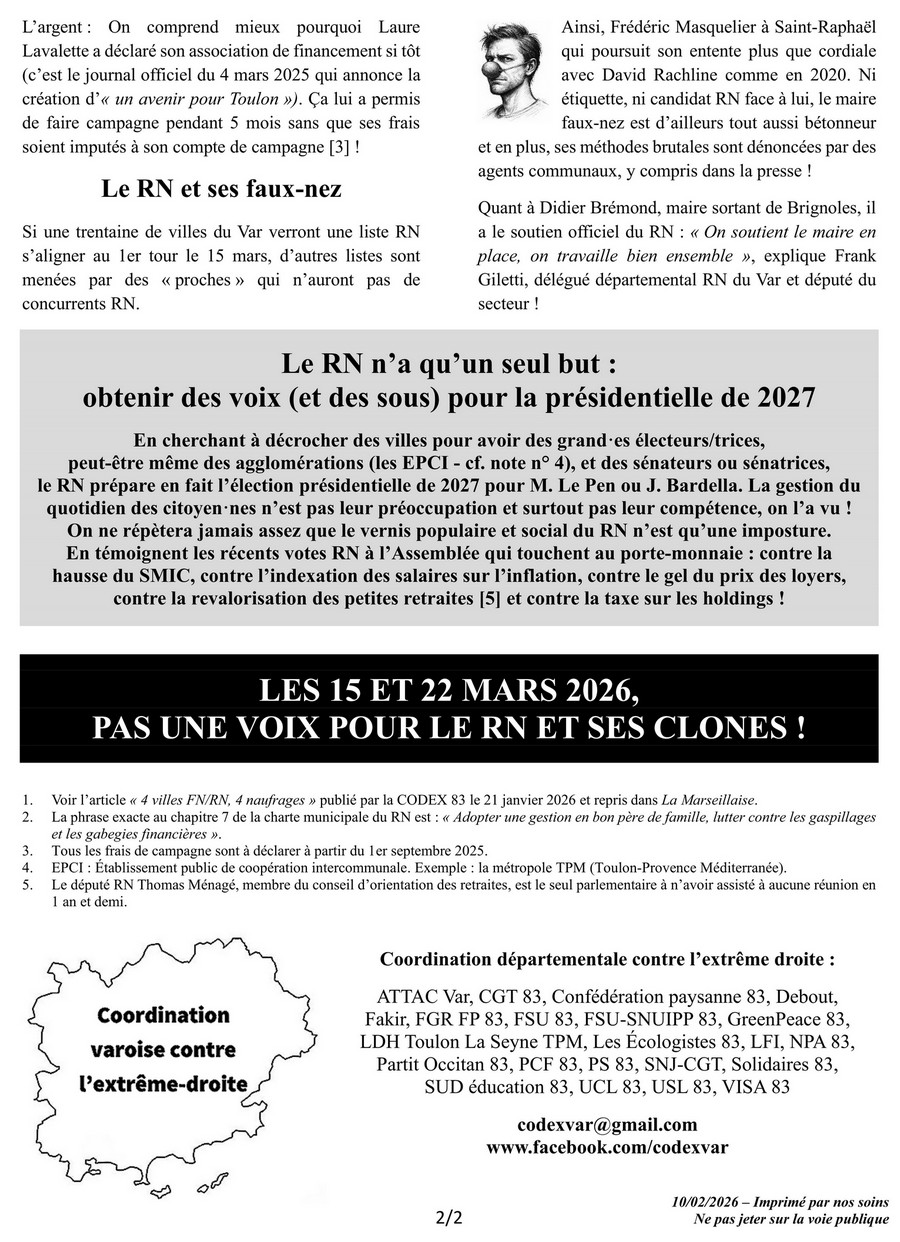 Ci-dessous le tract publié le 10 février 2026 par la Coordination départementale contre l’extrême droite (CODEX 83) à l’approche des élections municipales du mois de mars.