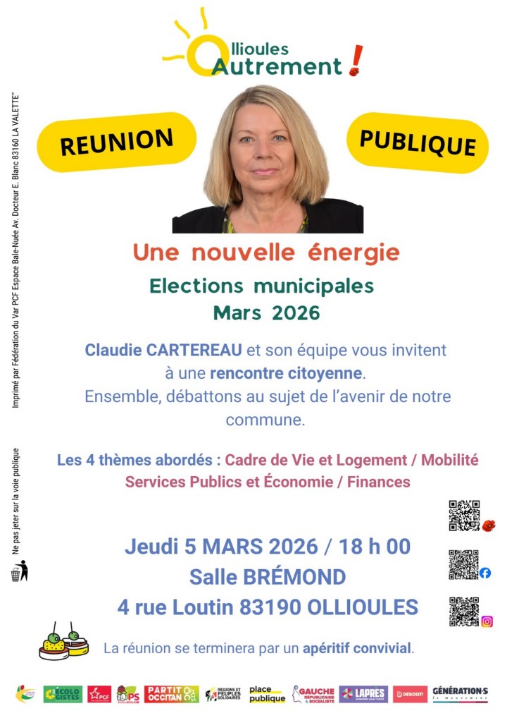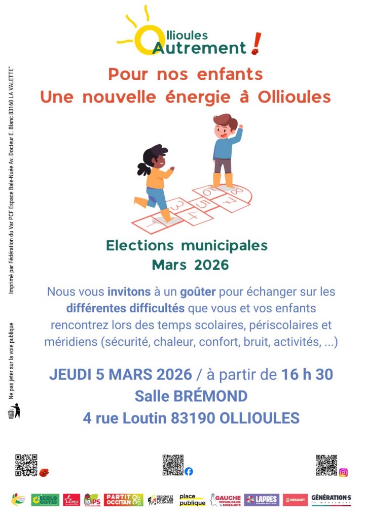 Jeudi 5 mars, dans la perspective des élections municipales, la liste Ollioules Autrement vous propose deux rendez-vous à l’Espace Brémond (4 rue Loutin).