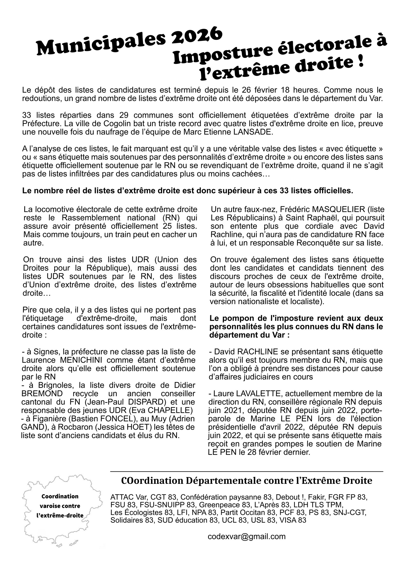 CODEX_tract-2026-03-05_Municipales-2026-imposture-electorale-a-l-extreme-droite_A4_page-01 Page 01 du tract « Municipales 2026, imposture électorale à l’extrême droite ! » publié le 5 mars 2026 par la CODEX 83 Partager : Imprimer(ouvre dans une nouvelle fenêtre) Imprimer Partager sur Facebook(ouvre dans une nouvelle fenêtre) Facebook Partager sur X(ouvre dans une nouvelle fenêtre) X Partager sur Mastodon(ouvre dans une nouvelle fenêtre) Mastodon Partager sur Bluesky(ouvre dans une nouvelle fenêtre) Bluesky Partager sur WhatsApp(ouvre dans une nouvelle fenêtre) WhatsApp Partager sur Telegram(ouvre dans une nouvelle fenêtre) Telegram Envoyer un lien par e-mail à un ami(ouvre dans une nouvelle fenêtre) E-mail J’aime chargement…