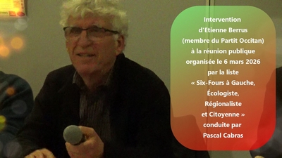 Intervention sur l’occitan provençal faite par Etienne Berrus (Partit Occitan dau País Tolonenc) à l’occasion de la réunion publique organisée le 6 mars par la liste « Six-Fours à Gauche, Écologiste, Régionaliste et Citoyenne » conduite par Pascal Cabras dans le cadre des élections municipales 2026.